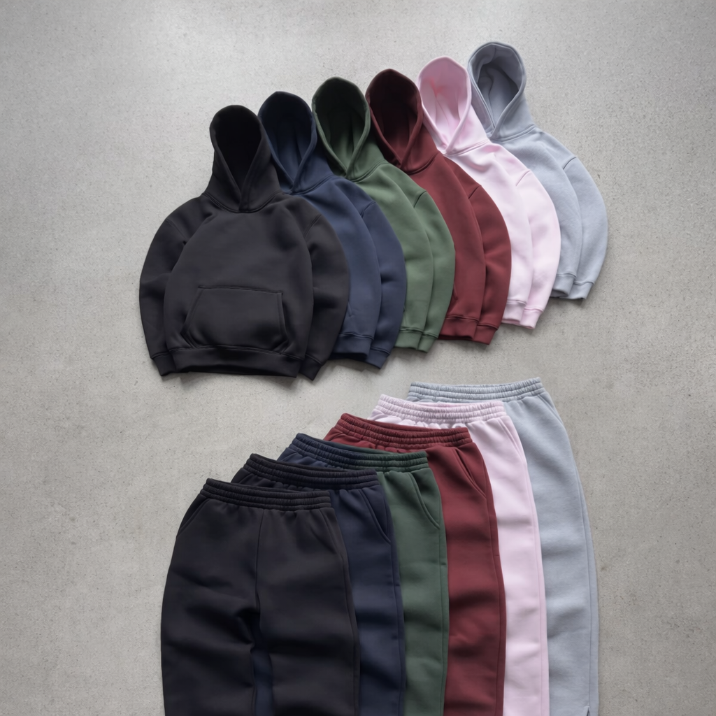 Chaque ensemble est conçu pour garder la même coupe oversize structurée et le même confort premium, peu importe la couleur.